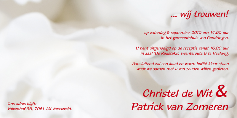 Welke tekst wil je gebruiken? Vul hieronder de gewenste teksten in Tekst pagina links (max. 14 regels) Boven tekst rechts (optioneel) Tekst pagina rechts (max. 14 regels) Eerste naam (max. 30 karakters) Tweede naam (max. 30 karakters) Bekijk voorbeeld Bestel monster van dit kaartje Standaardvoorbeeld buitenzijde Standaardvoorbeeld binnenzijde