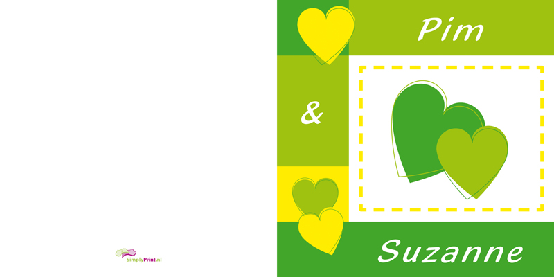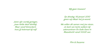 Welke tekst wil je gebruiken? Vul hieronder de gewenste teksten in Naam 1 (optioneel) Naam 2 (optioneel) Tekst pagina links (max. 14 regels) Tekst pagina rechts (max. 14 regels) Bekijk voorbeeld Bestel monster van dit kaartje Standaardvoorbeeld buitenzijde Standaardvoorbeeld binnenzijde
