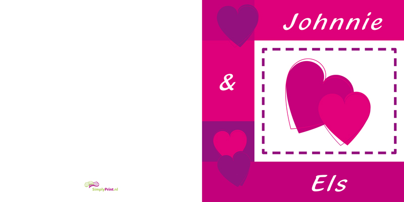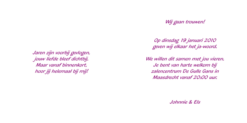 Welke tekst wil je gebruiken? Vul hieronder de gewenste teksten in Naam 1 (optioneel) Naam 2 (optioneel) Tekst pagina links (max. 14 regels) Tekst pagina rechts (max. 14 regels) Bekijk voorbeeld Bestel monster van dit kaartje Standaardvoorbeeld buitenzijde Standaardvoorbeeld binnenzijde