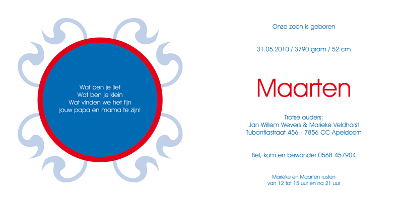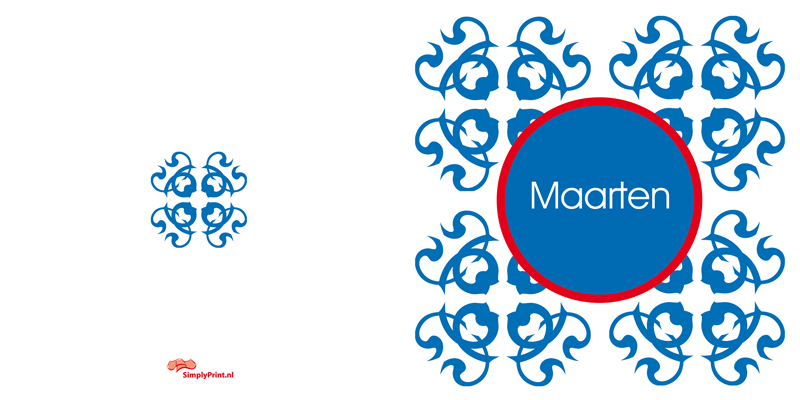 Welke tekst wil je gebruiken? Vul hieronder de gewenste teksten in Tekst pagina links (max. 4 regels) Tekst boven de naam (max. 3 regels) Naam (max. 25 karakters) Tekst onder de naam (max. 8 regels) Kleine tekst rechtsonder (max. 2 regels) Bekijk voorbeeld Bestel monster van dit kaartje Standaardvoorbeeld buitenzijde Standaardvoorbeeld binnenzijde
