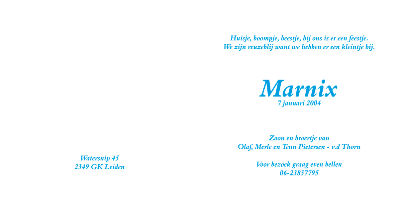 Welke tekst wil je gebruiken? Vul hieronder de gewenste teksten in Naam (max. 20 karakters) Straat en huisnummer (max. 45 karakters) Postcode en plaats (max. 35 karakters) Gedicht (max. 2 regels) We zijn reuzeblij, want we hebben er een kleintje bij. Geboortedatum (optioneel) Tekst onder naam (max. 2 regels) Zoon/dochter en broertje/zusje van ... Bewonderen (max. 2 regels) Voor bezoek graag even bellen. (06-64652425) Bekijk voorbeeld Bestel monster van dit kaartje Standaardvoorbeeld buitenzijde Standaardvoorbeeld binnenzijde