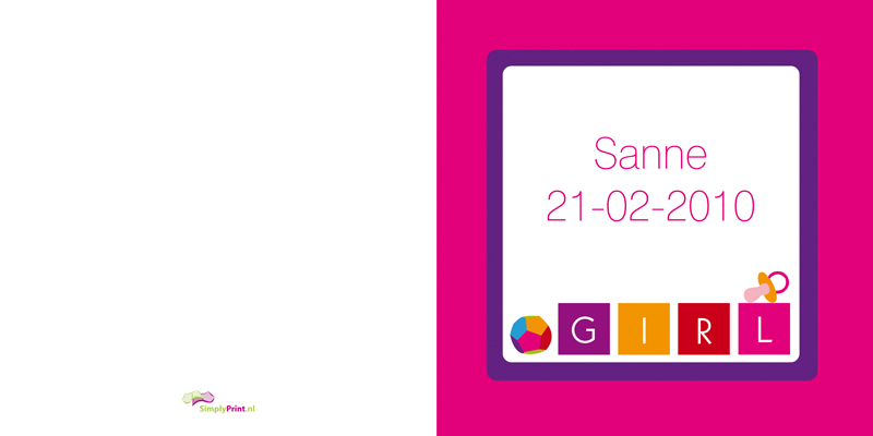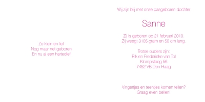 Welke tekst wil je gebruiken? Vul hieronder de gewenste teksten in Naam (max. 25 karakters) Geboortedatum voorkant (optioneel) Tekst pagina links (max. 4 regels) Tekst boven de naam (max. 2 regels) Tekst onder de naam (max. 11 regels) Bekijk voorbeeld Bestel monster van dit kaartje Standaardvoorbeeld buitenzijde Standaardvoorbeeld binnenzijde