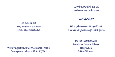 Welke tekst wil je gebruiken? Vul hieronder de gewenste teksten in Tekst pagina links (max. 8 regels) Tekst boven de naam (max. 3 regels) Naam (max. 25 karakters) Tekst onder de naam (max. 8 regels) Bekijk voorbeeld Bestel monster van dit kaartje Standaardvoorbeeld buitenzijde Standaardvoorbeeld binnenzijde