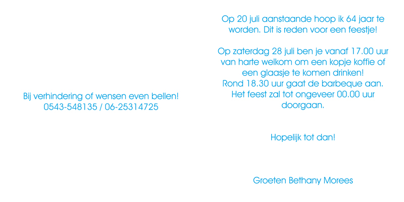 Welke tekst wil je gebruiken? Vul hieronder de gewenste teksten in Tekst voorzijde (max. 2 karakters) Tekst pagina links (max. 14 regels) Tekst pagina rechts (max. 14 regels) Bekijk voorbeeld Bestel monster van dit kaartje Standaardvoorbeeld buitenzijde Standaardvoorbeeld binnenzijde