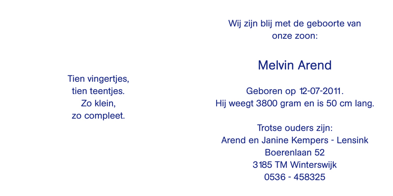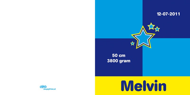 Welke tekst wil je gebruiken? Vul hieronder de gewenste teksten in Naam (max. 25 karakters) Geboortedatum voorkant (max. 2 regels) Lengte/gewicht voorkant (max. 2 regels) Tekst pagina links (max. 4 regels) Tekst boven de naam (max. 2 regels) Tekst onder de naam (max. 8 regels) Bekijk voorbeeld Bestel monster van dit kaartje Standaardvoorbeeld buitenzijde Standaardvoorbeeld binnenzijde