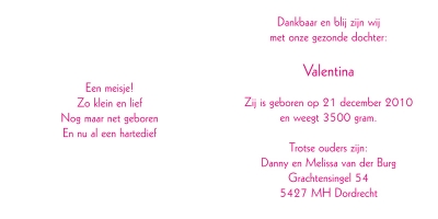 Welke tekst wil je gebruiken? Vul hieronder de gewenste teksten in Naam (max. 25 karakters) Tekst pagina links (max. 4 regels) Tekst boven de naam (max. 2 regels) Tekst onder de naam (max. 8 regels) Bekijk voorbeeld Bestel monster van dit kaartje Standaardvoorbeeld buitenzijde Standaardvoorbeeld binnenzijde