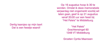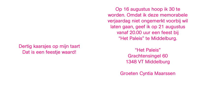 Welke tekst wil je gebruiken? Vul hieronder de gewenste teksten in Getal (max. 3 karakters) Tekst links (max. 14 regels) Tekst rechts (max. 14 regels) Bekijk voorbeeld Bestel monster van dit kaartje Standaardvoorbeeld buitenzijde Standaardvoorbeeld binnenzijde