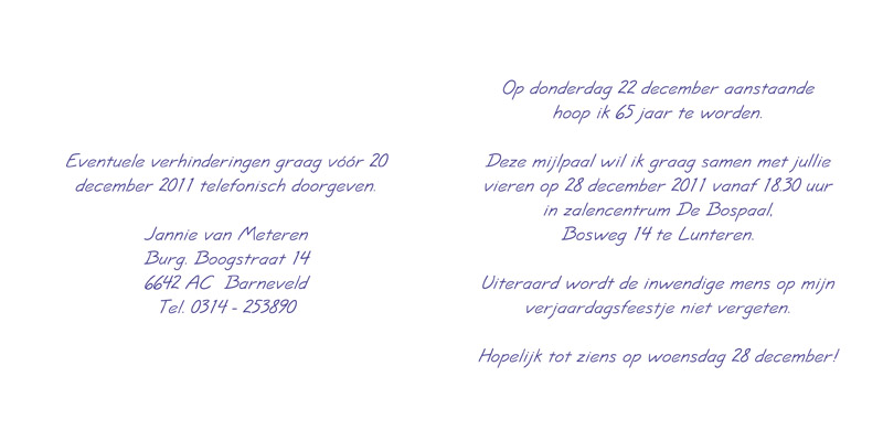Welke tekst wil je gebruiken? Vul hieronder de gewenste teksten in Tekst voorkant boven (optioneel) Tekst voorkant onder (optioneel) Tekst links (max. 14 regels) Tekst rechts (max. 14 regels) Bekijk voorbeeld Bestel monster van dit kaartje Standaardvoorbeeld buitenzijde Standaardvoorbeeld binnenzijde