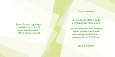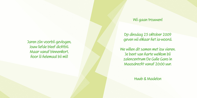 Welke tekst wil je gebruiken? Vul hieronder de gewenste teksten in Namen (optioneel) Trouwen (optioneel) Tekst Links (max. 12 regels) Jaren zijn voorbij gevlogen, jouw liefde bleef dichtbij. Maar vanaf binnenkort, hoor jij helemaal bij mij! Tekst Rechts (max. 12 regels) Wij gaan trouwen! Op dinsdag 25 oktober 2009 geven wij elkaar het ja-woord. We willen dit samen met jou vieren. Je bent van harte welkom bij zalencentrum De Gulle Gans in Maasdrecht vanaf 20:00 uur. Marcel en Klaartje Bekijk voorbeeld Bestel monster van dit kaartje Standaardvoorbeeld buitenzijde Standaardvoorbeeld binnenzijde