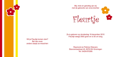 Welke tekst wil je gebruiken? Vul hieronder de gewenste teksten in Tekst pagina links (max. 17 regels) Tekst boven de naam (max. 2 regels) Naam (max. 25 karakters) Tekst onder de naam (max. 11 regels) Bekijk voorbeeld Bestel monster van dit kaartje Standaardvoorbeeld buitenzijde Standaardvoorbeeld binnenzijde