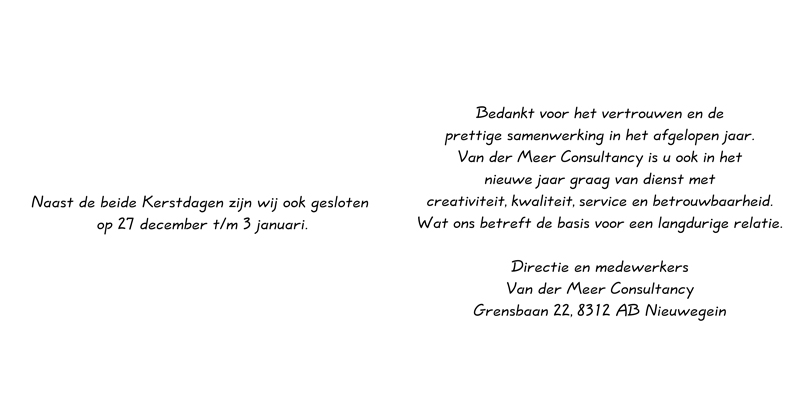 Welke tekst wil je gebruiken? Vul hieronder de gewenste teksten in Tekst voorkant boven (max. 2 regels) Tekst voorkant onder (max. 2 regels) Tekst pagina links (max. 12 regels) Tekst pagina rechts (max. 12 regels) Bekijk voorbeeld Bestel monster van dit kaartje Standaardvoorbeeld buitenzijde Standaardvoorbeeld binnenzijde