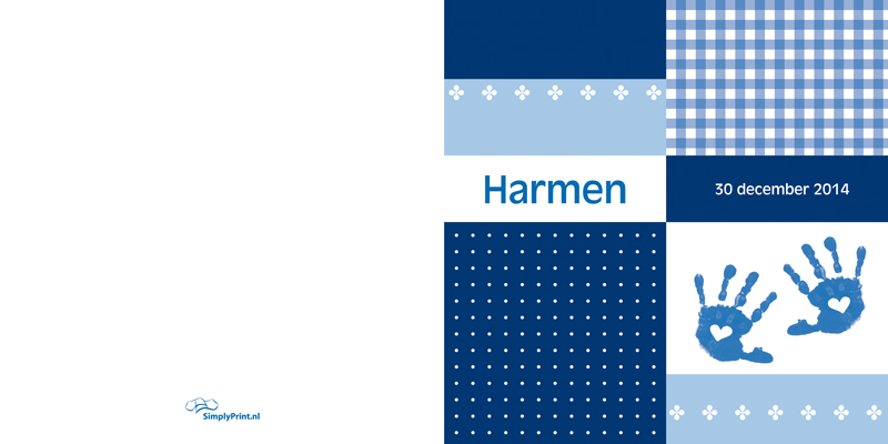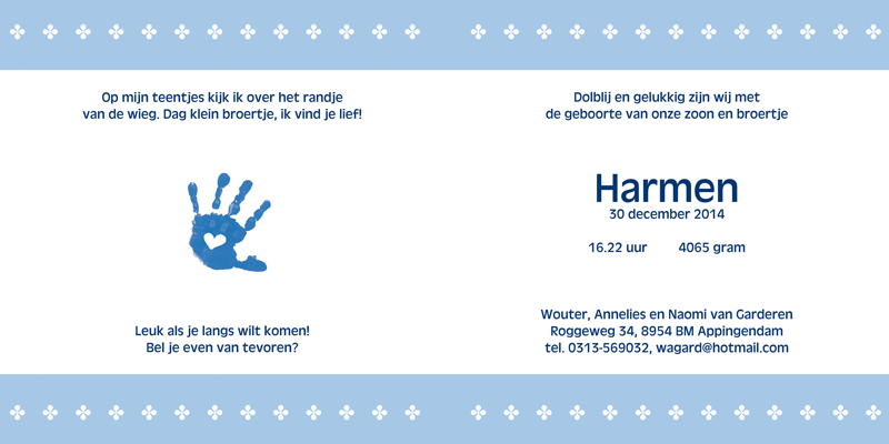 Welke tekst wil je gebruiken? Vul hieronder de gewenste teksten in Geboortedatum (max. 25 karakters) Naam (max. 25 karakters) Tekst pagina links boven (max. 3 regels) Tekst pagina links onder (max. 3 regels) Tekst boven de naam (max. 2 regels) Tekst onder de naam (max. 7 regels) Bekijk voorbeeld Bestel monster van dit kaartje Standaardvoorbeeld buitenzijde Standaardvoorbeeld binnenzijde