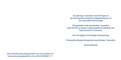 Welke tekst wil je gebruiken? Vul hieronder de gewenste teksten in Tekst voorkant (max. 4 regels) Tekst pagina links (max. 14 regels) Tekst pagina rechts (max. 14 regels) Bekijk voorbeeld Bestel monster van dit kaartje Standaardvoorbeeld buitenzijde Standaardvoorbeeld binnenzijde