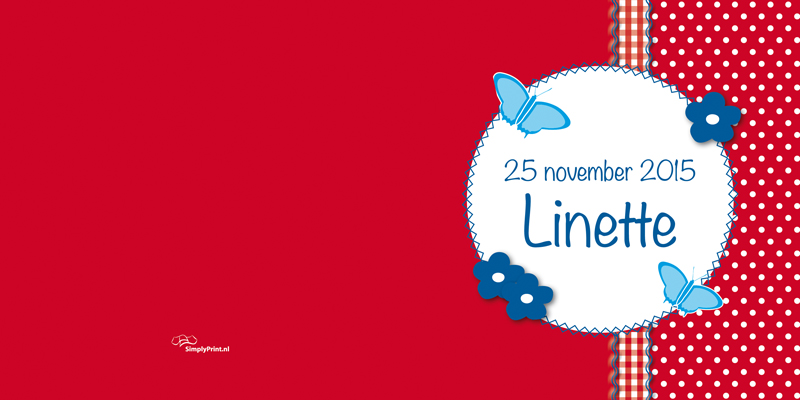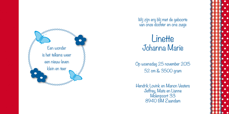 Welke tekst wil je gebruiken? Vul hieronder de gewenste teksten in Geboortedatum (max. 25 karakters) Naam (max. 25 karakters) Tekst pagina links (max. 4 regels) Tekst boven de naam (max. 2 regels) Extra naam (optioneel) Tekst onder de naam (max. 7 regels) Bekijk voorbeeld Bestel monster van dit kaartje Standaardvoorbeeld buitenzijde Standaardvoorbeeld binnenzijde
