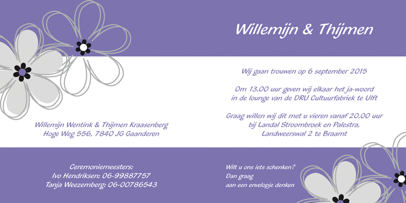 Welke tekst wil je gebruiken? Vul hieronder de gewenste teksten in Tekst voorkant (max. 2 regels) Tekst links (max. 2 regels) Tekst links onder (max. 3 regels) Tekst rechts boven (optioneel) Tekst rechts (max. 8 regels) Tekst rechts onder (max. 3 regels) Bekijk voorbeeld Bestel monster van dit kaartje Standaardvoorbeeld buitenzijde Standaardvoorbeeld binnenzijde