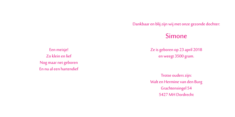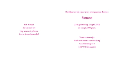 Welke tekst wil je gebruiken? Vul hieronder de gewenste teksten in Tekst boven op voorkant (max. 25 karakters) Naam (max. 25 karakters) Tekst pagina links (max. 9 regels) Tekst boven de naam (max. 2 regels) Tekst onder de naam (max. 9 regels) Bekijk voorbeeld Bestel monster van dit kaartje Standaardvoorbeeld buitenzijde Standaardvoorbeeld binnenzijde