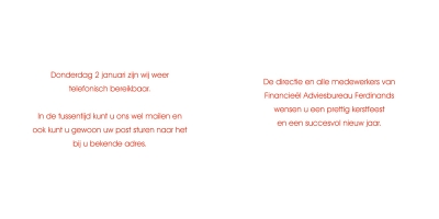 Welke tekst wil je gebruiken? Vul hieronder de gewenste teksten in Tekst voorkant boven (max. 20 karakters) Tekst voorkant midden (max. 20 karakters) Tekst voorkant onder (max. 20 karakters) Tekst pagina links (max. 12 regels) Tekst pagina rechts (max. 12 regels) Bekijk voorbeeld Bestel monster van dit kaartje Standaardvoorbeeld buitenzijde Standaardvoorbeeld binnenzijde