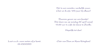 Welke tekst wil je gebruiken? Vul hieronder de gewenste teksten in Getal (optioneel) Tekst Links (max. 12 regels) Laat a.u.b. even weten of je komt. 06-23645923 Tekst Rechts (max. 12 regels) Het is een wonder, werkelijk waar. Clair en ik zijn 12,5 jaar bij elkaar! Daarom geven we een feestje! Dat doen we op zondag 29 april vanaf 15:00 uur in café de Geus in Zwolle. Hopelijk tot dan! Clair van Dam en Kees Kringland Bekijk voorbeeld Bestel monster van dit kaartje Standaardvoorbeeld buitenzijde Standaardvoorbeeld binnenzijde