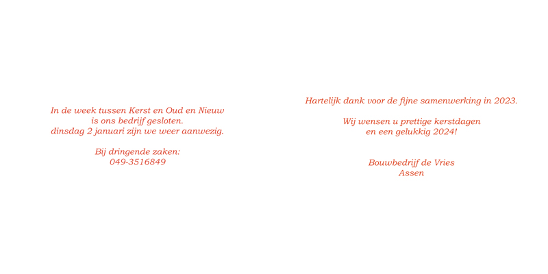 Welke tekst wil je gebruiken? Vul hieronder de gewenste teksten in Tekst voorkant onder (max. 30 karakters) Tekst pagina links (max. 12 regels) Tekst pagina rechts (max. 12 regels) Bekijk voorbeeld Bestel monster van dit kaartje Standaardvoorbeeld buitenzijde Standaardvoorbeeld binnenzijde