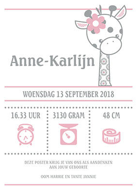 Welke tekst wil je gebruiken? Geboorteposter Giraf roze Naam (max. 50 karakters) Geboortedatum (graag invoeren als 14 december 2020) Tijdstip (optioneel) Gewicht in gram (optioneel) Lengte in cm (optioneel) Persoonlijke boodschap (max. 4 regels) Aantal (hogere oplages op aanvraag) 1 (€ 11,95) 2 (€ 13,45) 3 (€ 14,95) 4 (€ 16,45) 5 (€ 17,95) 6 (€ 19,45) 7 (€ 20,95) 8 (€ 22,45) 9 (€ 23,95) 10 (€ 25,45) 11 (€ 26,95) 12 (€ 28,45) 13 (€ 29,95) 14 (€ 31,45) 15 (€ 32,95) 16 (€ 34,45) 17 (€ 35,95) 18 (€ 37,45) 19 (€ 38,95) 20 (€ 40,45) Verder Door u gekozen versieKies een andere uitvoering