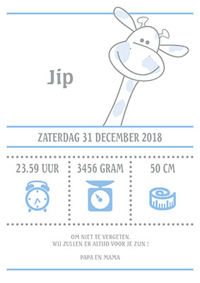 Welke tekst wil je gebruiken? Geboorteposter Giraf blauw Naam (max. 50 karakters) Geboortedatum (graag invoeren als 14 december 2020) Tijdstip (optioneel) Gewicht in gram (optioneel) Lengte in cm (optioneel) Persoonlijke boodschap (max. 4 regels) Aantal (hogere oplages op aanvraag) 1 (€ 11,95) 2 (€ 13,45) 3 (€ 14,95) 4 (€ 16,45) 5 (€ 17,95) 6 (€ 19,45) 7 (€ 20,95) 8 (€ 22,45) 9 (€ 23,95) 10 (€ 25,45) 11 (€ 26,95) 12 (€ 28,45) 13 (€ 29,95) 14 (€ 31,45) 15 (€ 32,95) 16 (€ 34,45) 17 (€ 35,95) 18 (€ 37,45) 19 (€ 38,95) 20 (€ 40,45) Verder Door u gekozen versieKies een andere uitvoering