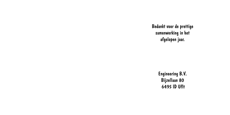 Welke tekst wil je gebruiken? Vul hieronder de gewenste teksten in Tekst voorkant boven (max. 30 karakters) Tekst voorkant onder (max. 30 karakters) Tekst pagina links (max. 14 regels) Tekst pagina rechts (max. 14 regels) Bekijk voorbeeld Bestel monster van dit kaartje Standaardvoorbeeld buitenzijde Standaardvoorbeeld binnenzijde