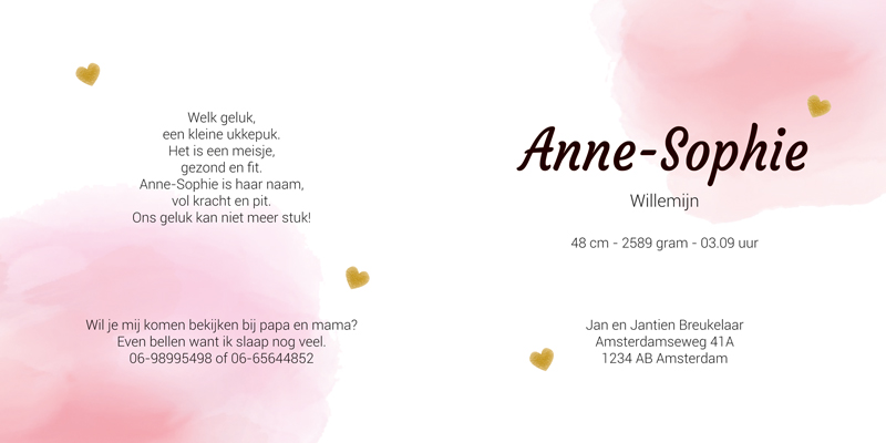 Welke tekst wil je gebruiken? Vul hieronder de gewenste teksten in Naam (max. 40 karakters) Geboortedatum (optioneel) Tekst links (max. 7 regels) Tekst linksonder (max. 4 regels) Extra namen of achternaam (optioneel) Lengte, gewicht & tijdstip (optioneel) Tekst rechtsonder (max. 4 regels) Bekijk voorbeeld Bestel monster van dit kaartje Standaardvoorbeeld buitenzijde Standaardvoorbeeld binnenzijde