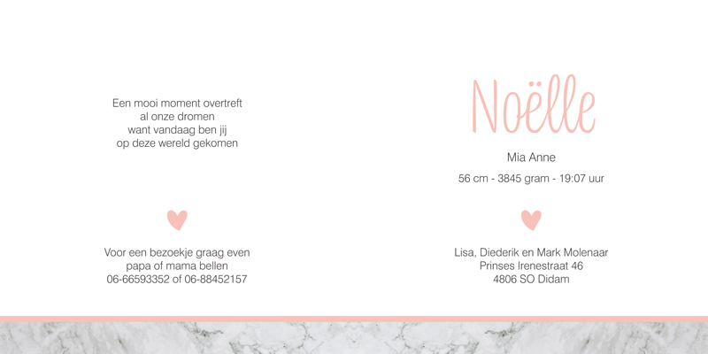 Welke tekst wil je gebruiken? Vul hieronder de gewenste teksten in Naam (max. 40 karakters) Geboortedatum (optioneel) Tekst links (max. 7 regels) Tekst linksonder (max. 4 regels) Extra namen of achternaam (optioneel) Lengte, gewicht & tijdstip (optioneel) Tekst rechtsonder (max. 4 regels) Bekijk voorbeeld Bestel monster van dit kaartje Standaardvoorbeeld buitenzijde Standaardvoorbeeld binnenzijde