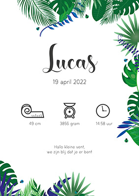 Welke tekst wil je gebruiken? Geboorteposter Tropisch Blauw Naam (max. 50 karakters) Geboortedatum (graag invoeren als 14 december 2020) Tijdstip (graag invoeren als 07:12 uur of 15:28 uur) Gewicht in gram (optioneel) Lengte in cm (optioneel) Persoonlijke boodschap (max. 4 regels) Aantal (hogere oplages op aanvraag) 1 (€ 11,95) 2 (€ 13,45) 3 (€ 14,95) 4 (€ 16,45) 5 (€ 17,95) 6 (€ 19,45) 7 (€ 20,95) 8 (€ 22,45) 9 (€ 23,95) 10 (€ 25,45) 11 (€ 26,95) 12 (€ 28,45) 13 (€ 29,95) 14 (€ 31,45) 15 (€ 32,95) 16 (€ 34,45) 17 (€ 35,95) 18 (€ 37,45) 19 (€ 38,95) 20 (€ 40,45) Verder Door u gekozen versieKies een andere uitvoering