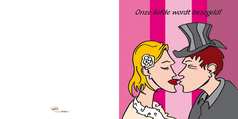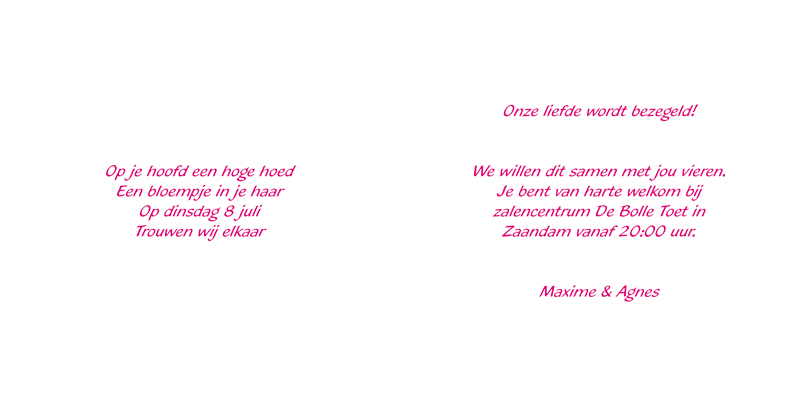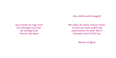 Welke tekst wil je gebruiken? Vul hieronder de gewenste teksten in Titel (optioneel) Tekst Links (max. 12 regels) Op je hoofd een hoge hoed Een bloempje in je haar Op dinsdag 8 juli Trouwen wij elkaar Tekst Rechts (max. 12 regels) Wij gaan trouwen! We willen dit samen met jou vieren. Je bent van harte welkom bij zalencentrum De Bolle Toet in Zaandam vanaf 20:00 uur. Maxime en Agnes Bekijk voorbeeld Bestel monster van dit kaartje Standaardvoorbeeld buitenzijde Standaardvoorbeeld binnenzijde