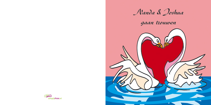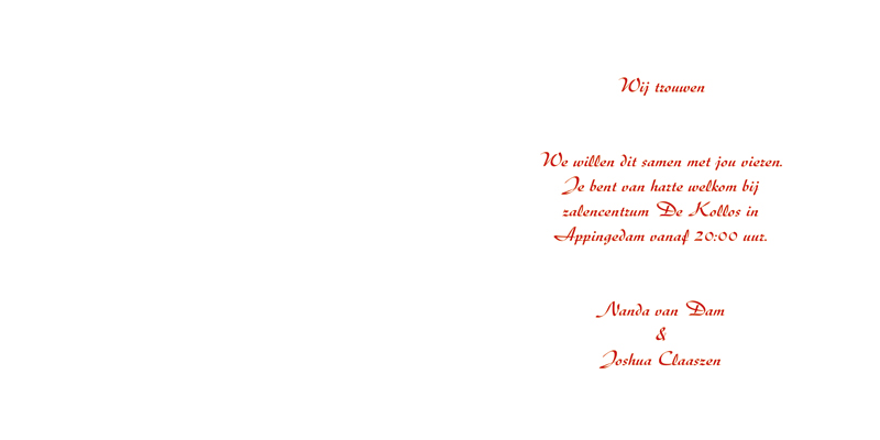 Welke tekst wil je gebruiken? Vul hieronder de gewenste teksten in Namen (optioneel) Trouwen (optioneel) Tekst Links (max. 12 regels) Tekst Rechts (max. 12 regels) Wij trouwen We willen dit samen met jou vieren. Je bent van harte welkom bij zalencentrum De Kollos in Appingedam vanaf 20:00 uur. Oliver van Dam & Annemarie Claaszen Bekijk voorbeeld Bestel monster van dit kaartje Standaardvoorbeeld buitenzijde Standaardvoorbeeld binnenzijde