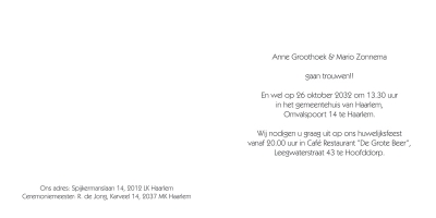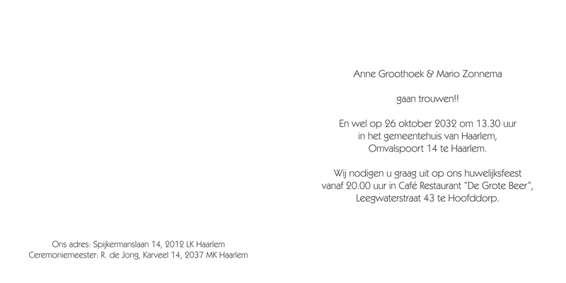 Welke tekst wil je gebruiken? Vul hieronder de gewenste teksten in Tekst Links (max. 12 regels) Ons adres: Spijkermanslaan 14, 2012 LK Haarlem Ceremoniemeester: R. de Jong, Karveel 14, 2037 MK Haarlem Tekst Rechts (max. 12 regels) Anne Groothoek & Menno Zonnema gaan trouwen!! en wel op 26 oktober 2032 om 13.30 uur in het gemeentehuis van Haarlem, Omvalspoort 14 te Haarlem. Wij nodigen u graag uit op ons huwelijksfeest vanaf 20.00 uur in Café Restaurant "De Grote Beer", Leegwaterstr Bekijk voorbeeld Bestel monster van dit kaartje Standaardvoorbeeld buitenzijde Standaardvoorbeeld binnenzijde