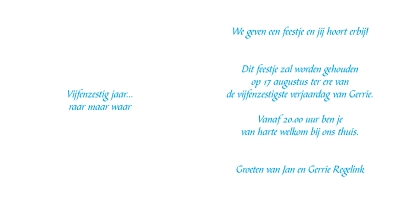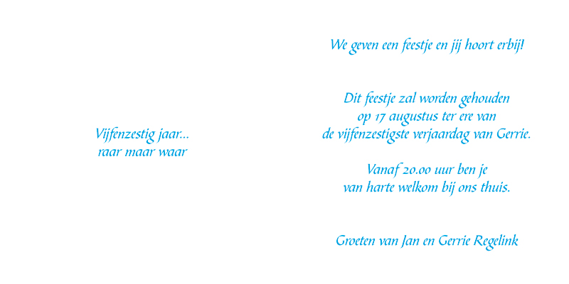 Welke tekst wil je gebruiken? Vul hieronder de gewenste teksten in Tekst voorzijde (max. 2 karakters) Tekst pagina links (max. 12 regels) Tekst pagina rechts (max. 12 regels) Bekijk voorbeeld Bestel monster van dit kaartje Standaardvoorbeeld buitenzijde Standaardvoorbeeld binnenzijde
