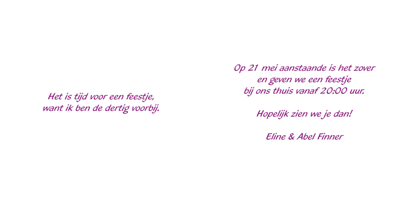 Welke tekst wil je gebruiken? Vul hieronder de gewenste teksten in Tekst voorzijde (max. 2 regels) 50 Tekst pagina links (max. 12 regels) Tekst pagina rechts (max. 12 regels) Bekijk voorbeeld Bestel monster van dit kaartje Standaardvoorbeeld buitenzijde Standaardvoorbeeld binnenzijde