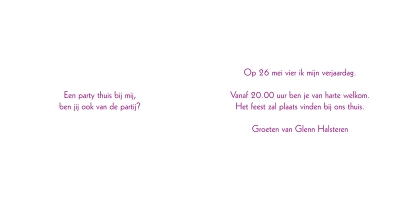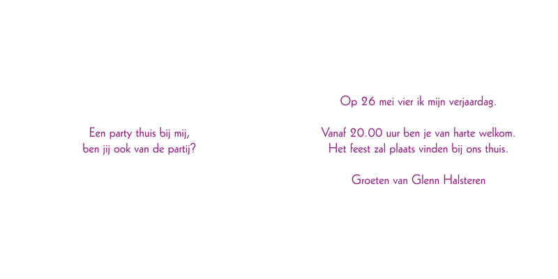 Welke tekst wil je gebruiken? Vul hieronder de gewenste teksten in Tekst voorkant (max. 40 karakters) Tekst pagina links (max. 14 regels) Tekst pagina rechts (max. 14 regels) Bekijk voorbeeld Bestel monster van dit kaartje Standaardvoorbeeld buitenzijde Standaardvoorbeeld binnenzijde