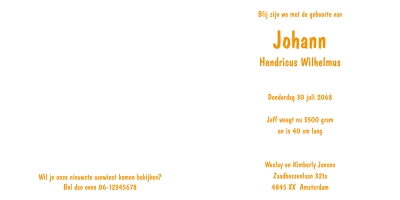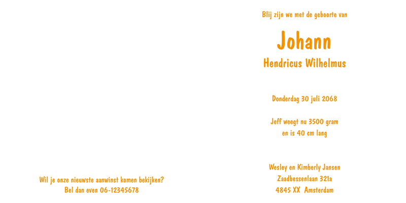 Welke tekst wil je gebruiken? Vul hieronder de gewenste teksten in Tekst voorzijde (max. 2 regels) Tekst pagina links (max. 2 regels) Tekst boven naam (optioneel) Naam (max. 25 karakters) Doopnaam (optioneel) Tekst onder naam (max. 9 regels) Bekijk voorbeeld Bestel monster van dit kaartje Standaardvoorbeeld buitenzijde Standaardvoorbeeld binnenzijde