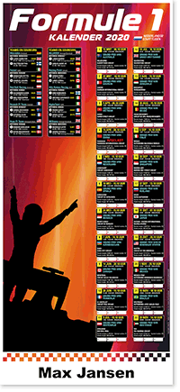 Met deze Formule 1 poster 2020 kunt u in één oogopslag het hele F1 seizoen overzien. Nederlandse starttijden, circuit informatie en informatie over de F1 coureurs zijn in het ontwerp opgenomen. Onderaan de Formule 1 poster is er ruimte voor uw eigen naam, familienaam, bedrijfsnaam of bijvoorbeeld uw verenigingsnaam. Het formaat van de jaarplanner is 660 mm x 297 mm STAAND. Het papier is hvmc silk 115 gr/m2.