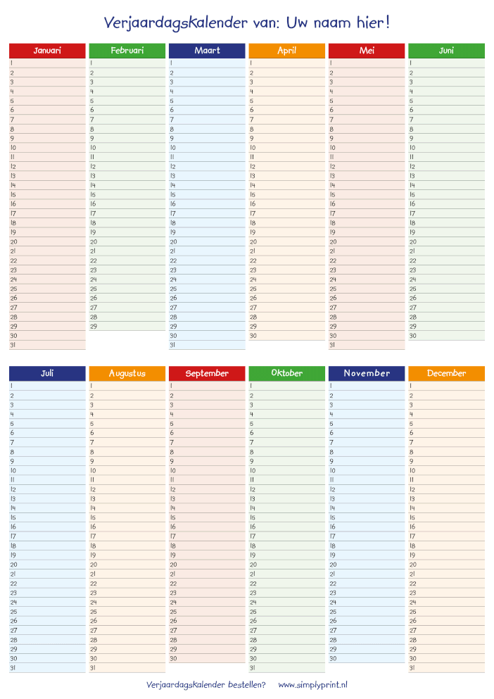 Met deze verjaardagskalender aan de wand kun je in één oogopslag alle verjaardagen overzien. Bovenaan de verjaardagskalender is er ruimte voor je eigen naam, familienaam, bedrijfsnaam of bijvoorbeeld je verenigingsnaam. Het formaat van deze poster is 297 mm x 420 mm (A3 STAAND). Het papier is hvmc silk 115 gr/m2.