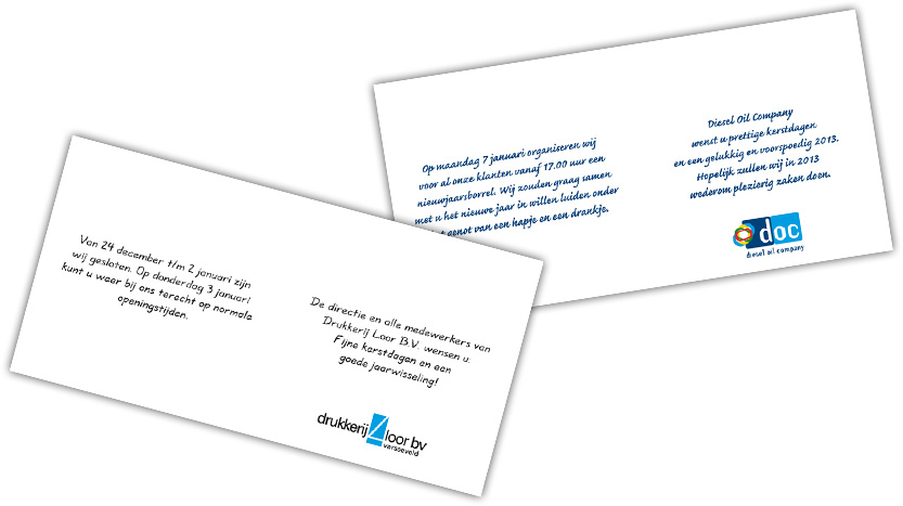 Speciaal voor haar zakelijke relaties biedt Drukkerij Loor B.V. de mogelijkheid om de door u gekozen Simplyprint kerstkaart te voorzien van uw eigen lettertype en logo in 4/0 full colour. Meerkosten bedragen 75 euro incl. BTW.